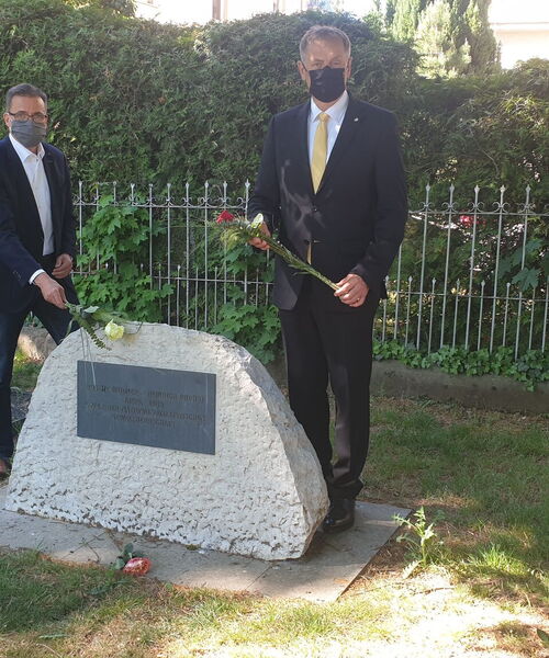 Zum Gedenken des Endes des zweiten Weltkriegs am 8. Mai 1945 erinnerte Oberbürgermeister Richard Arnold in der Sitzung des Gemeinderatsausschusses am Mittwoch an die Geschehnisse vor 75 Jahren. Er legte gemeinsam mit dem Ersten Bürgermeister Dr. Joachim Bläse am Gedenkstein der damals ermordeten Robert Haidner und Heinrich Probst in der Grabenallee Rosen nieder - die Vorgaben der Corona-Verordnung lassen in diesen Tagen keine gemeinsam gefeierte Gedenkveranstaltung zu.